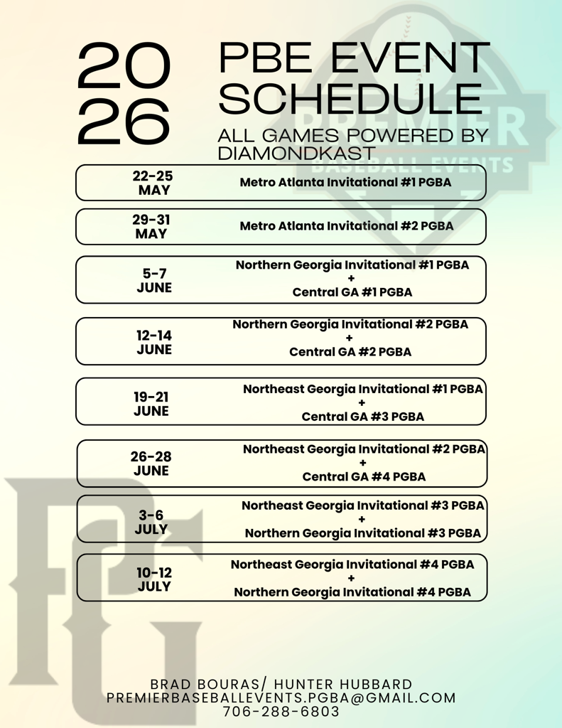 REGISTRATION: Once your request is submitted, you will get an email acceptance from Premier Baseball Events and PGBA to register and pay for your team.